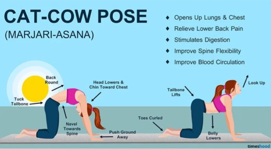 Now on your hands and knees with your knees underneath your hip your hands underneath your shoulders keep your spine neutral so your belly is held in your neck is in line for a cow pose or cat pose drop your belly down and lift your chin up take a big breath in and exhale for cat back round your spine tuck your chin tuck your tailbone and press the space between your shoulder blades off to the ceiling for one breath one movement inhale cow pose belly drops chin lift exhale cat back round your spine tuck your chin inhale cow belly drop exhale cat round your spine inhale cow exhale cat now come back to Center with a neutral spine so your neck is in line.